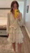 Elegant ivory dress with textured fabric. Features ruffle layers and tie waist. Perfect for events.