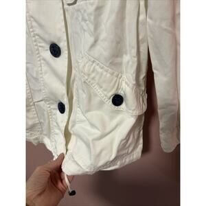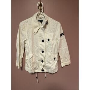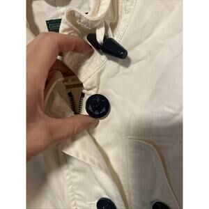 This jacket is amazing. Perfect for so many occasions. Great wardrobe staple. White with navy embroidery. Patch on arm. Zipper and buttons. Lots of pockets.