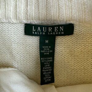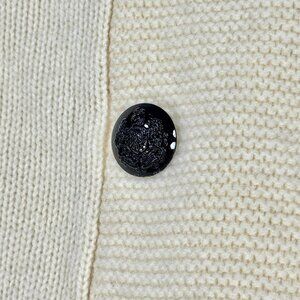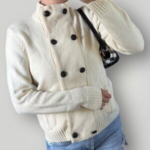 Elegant Lauren Ralph Lauren double-breasted cardigan crafted from 100% lambswool with cotton trim. Features embossed crest-style black buttons, ribbed cuffs and hem, and a tailored silhouette reminiscent of a naval pea coat. The soft cream knit adds a refined, classic look — perfect for fall layering or polished casualwear.