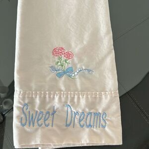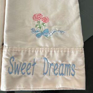 Pillowcases is a light pink- embroidery is shades of light blue, pink, white and light green