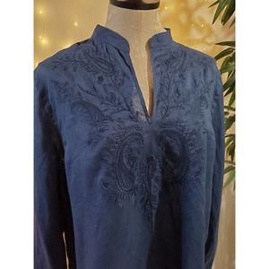 Lauren Ralph Lauren Linen Embroidered Boho Elegant Blouse Womens Size XL Blue