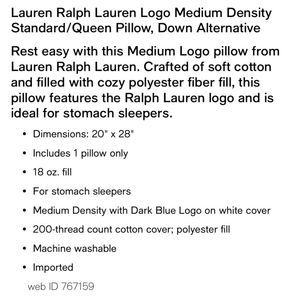 Lauren Ralph Lauren - Logo Médium Density Standard/Queen Pillow - NWT
