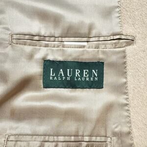 Pre-loved men’s Lauren Ralph Lauren 100% camel hair tan neutral lined classic blazer. Features three exterior pockets and three interior pockets.