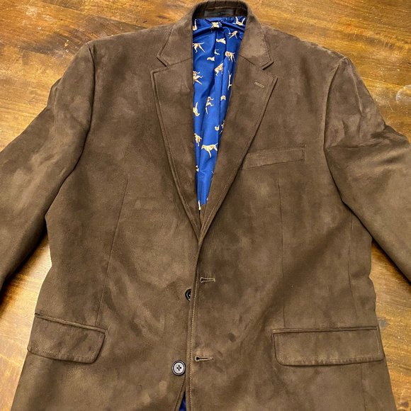 Size 42R, brown, 100% polyester, has a suede feel to it. Cool dog pattern on the lining. Only worn a few times, in great shape. Really cool style. It doesn’t fit me anymore.