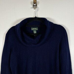 This Lauren Ralph Lauren sweater is crafted from a blend of Merino wool, cashmere, and angora rabbit fabric in a solid blue color. The tight-knit pullover style features a cowl neck, long sleeves, and a regular fit for a classy and classic look. It is lightweight, breathable, and stretchy, making it suitable for winter, fall, and spring seasons. Ideal for travel, casual wear, workwear, or business attire, this sweater in size L is designed for women looking for a designer, career-oriented, and preppy style without compromising on comfort and quality.