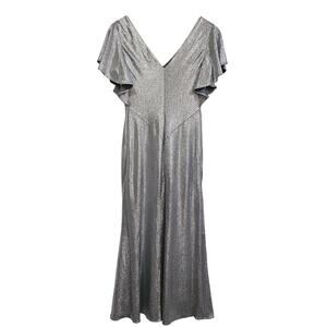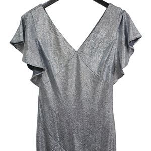 🔍 Keywords: formal dress | evening gown | long dress | special occasion | holiday party dress | silver metallic | Ralph Lauren dress | flutter sleeve gown