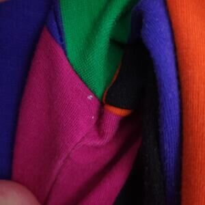 Features: Three-quarter sleeves. Style 200192203997. Beautifully designed multicolor dress with geometric color blocking, crewneck trimmed with faux-leather, zipper on the back. Fabric: viscose, elastane. Overall very good condition, three pinprick holes under one arm where price barb was.