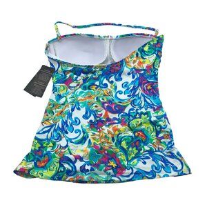 Slimming fit tankini top with colorful print and shirred panel. Ideal for a flattering silhouette.