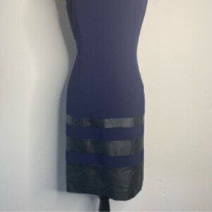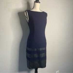 Lauren Ralph Lauren Navy Blue With Horizontal Black Leather Stripes Sleeveless Knee Length Sheath Dress