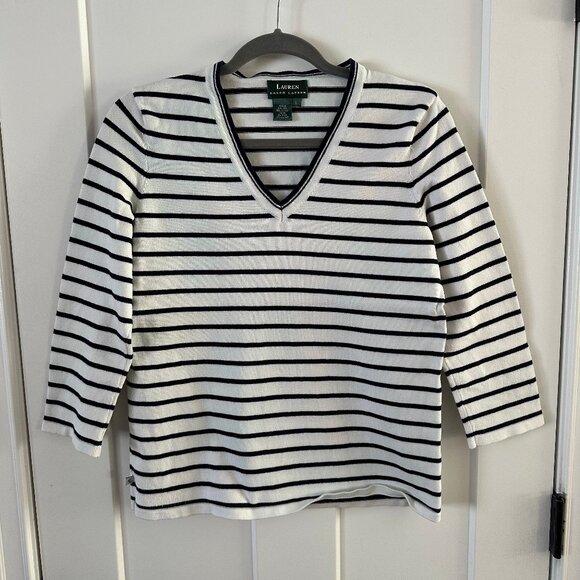 Lauren Ralph Lauren striped knit sweater in a classic navy and cream colorway (navy, not black). Soft, lightweight knit with a flattering V-neckline and 3/4 length sleeves. A timeless, nautical-inspired style that works well for casual wear, office layering, or transitional seasons.