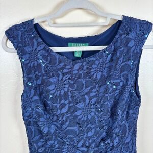 Elegant navy blue sheath dress from Lauren Ralph Lauren featuring floral lace overlay and tonal sequin embellishment. Fully lined with ruched detailing at the waist for a flattering fit. Sleeveless design with a modest scoop neckline. Perfect for weddings, cocktail parties, and formal occasions.