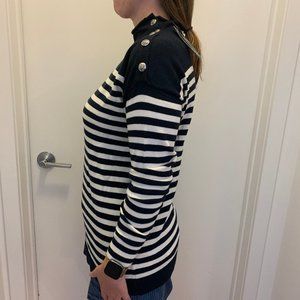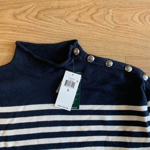 New with Tags Lauren Ralph Lauren Women's Navy Striped Short Turtleneck Sweater with Shoulder Buttons