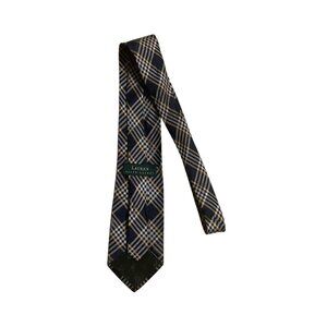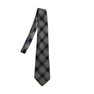A classic plaid silk tie that adds sophistication to professional attire, featuring a timeless navy and yellow design. Ideal for formal or office wear.