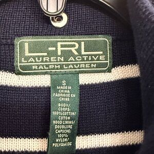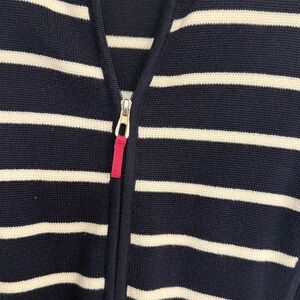Elegant navy and white striped knit sweater by Lauren Ralph Lauren. Features a zip closure and classic design. Pink pull tab on zipper and pink side tab with logo detail. 100% cotton. Size S