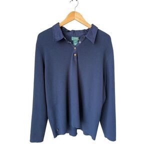 Lauren Ralph Lauren Navy Blue Collard Ribbed Knit Pullover Ling Sleeve top