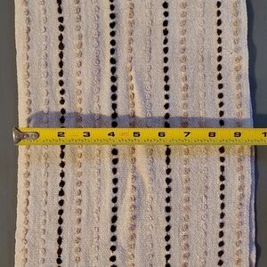 OATMEAL NEUTRAL SCARF WITH TEXTURED RAISED DOT PATTERN. SHADES OF CREAM,TAN AND BROWNS. FRINGE ON ENDS.