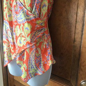 Lauren Ralph Lauren Petite; Pullover Top; Orange with Blue, Yellow and Green Paisley; 6 Petite; Sleeveless; Racerback; Back Stand-Up Collar; Pintuck Pleats at Shoulders; Surplice Front w/Ruched Left; Handkerchief Hemline; 100% Polyester; Dry Clean; Armpit to Armpit 18"; Armpit to Hem 14"; Length 23"