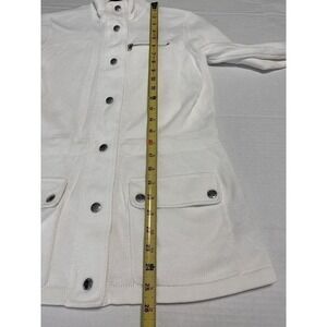 This jacket is a petite size P/P and should be hand washed only. It's white in color and has a cotton lining material. The accents are buttons and it has features like zipped pockets, full button, stretch, and pockets. The jacket has a fancy, classic, preppy, and modern theme and is suitable for winter, fall, and spring seasons. Made in China and not handmade, this jacket is an excellent addition to any wardrobe.