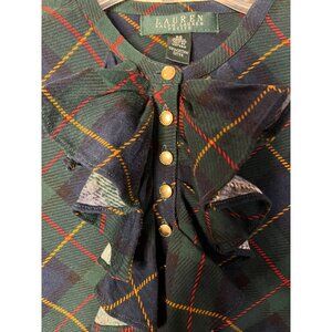 Lauren Ralph Lauren petite small pull over top in a green, red, and yellow plaid design. Features a ruffle on the chest, 3/4 sleeves, and is 100% cotton. Made in Vietnam, machine washable.