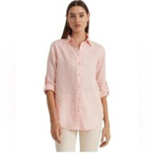 Lauren Ralph Lauren Pink Linen Button-Down Shirt Roll-Top Sleeves Top Medium EUC