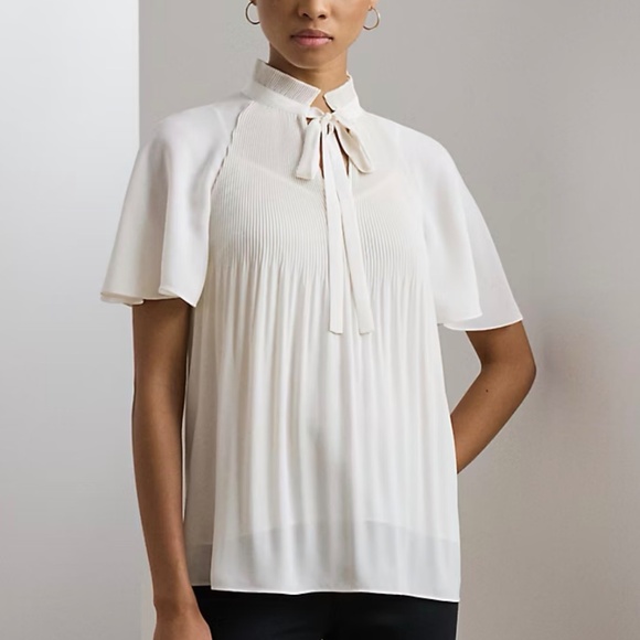 The top has a refined tie-neck detail, finely pleated front, and flutter-style short sleeves that create a graceful, feminine silhouette.