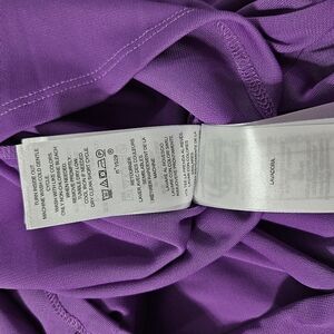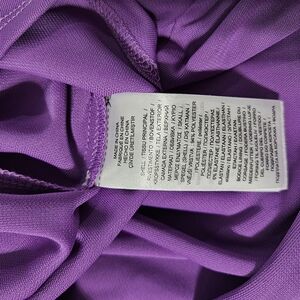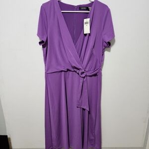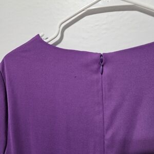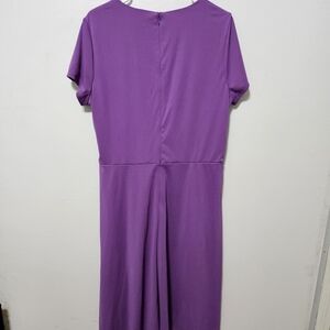 Elegant purple midi dress. Features a wrap design with a knot detail. Short sleeves. Perfect for any occasion.