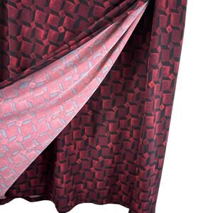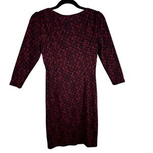 Excellent preowned condition. Red & black 3/4 sleeve faux wrap V-Neck pullover stretchy jersey knit midi dress. Polyester/spandex material. Approx. measurements: Shoulder to hem 42", pit to pit 18", sleeve from neck to sleeve hem 20", waist across 14". Size 4.