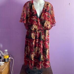 Details: Lauren Ralph Lauren sheer women's dress with black lining plunging neckline and fall colors in a floral pattern size 12