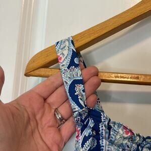 Beautiful Lauren Ralph Lauren summer dress featuring a classic paisley print in royal blue, aqua, and hints of pink. Designed with wide shoulder straps and a softly gathered neckline for an easy, relaxed fit. Perfect for warm weather, vacations, or casual weekends.