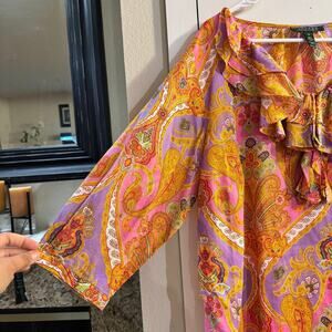 Lauren Ralph Lauren Ruffled Multicolor Paisley Cotton 3/4 Button Sleeve Top 1X