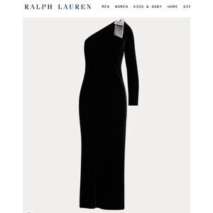 Orig $295. Rare Lauren Ralph Lauren (green tag) one-shoulder maxi/floor-length dress, in size small / sm / S. Rich black color. An elegant drape and a figure-skimming silhouette, this one-shoulder A-line dress is a statement piece dress / gown. Flowy, comfortable, flattering. Comfy, feminine, stunning. An exquisite take on the LBD (Little Black Dress.)