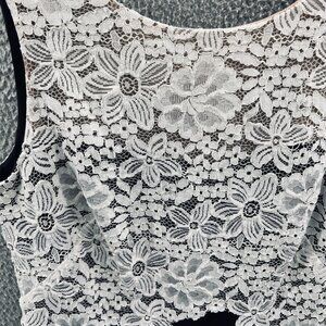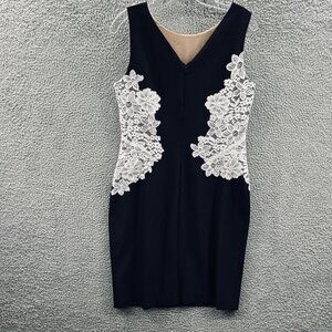 Elegant sleeveless cocktail sheath with white floral lace overlay detail