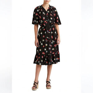 Lauren Ralph Lauren Sherolynn Floral Crepe Tie-Neck Midi Dress Black Red Size 8