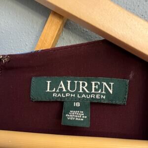 Lauren Ralph Lauren shift dress with 3/4 sleeves. Maroon with blue floral pattern. Size 16