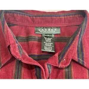 This product is a women's large red corduroy striped shirt from Lauren Ralph Lauren. It features a collared neckline, long sleeves with button accents, and a pullover closure. The shirt is suitable for casual, business, or travel occasions and is made of lightweight and breathable cotton material. With a vintage feel and a mix of nature, western, and preppy themes, this basic button-up top is easy to care for with machine washable fabric. Perfect for all seasons, this shirt offers a classic and comfortable fit for the modern woman.