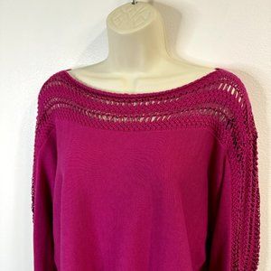 Fuschia pink silk and cotton blend knit sweater. Crochet accent at neckline and sleeves. 3/4 length sleeves.