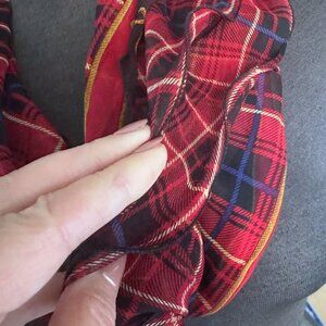 Lauren by Ralph Lauren ruffle scarf. Classic plaid pattern of red & black with thin blue stripe and delicate gold detailing. Could be used as a neck or purse scarf. In good pre-loved condition with some minor signs of wear. Approximate measurements: Length 42”, width 11”.