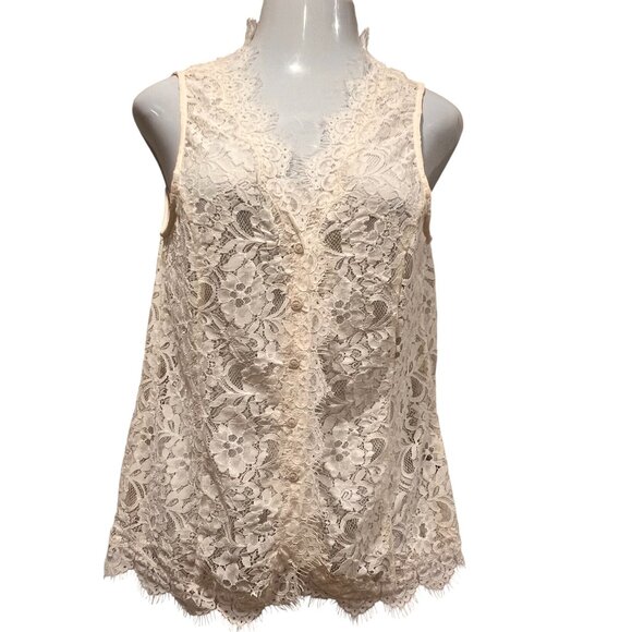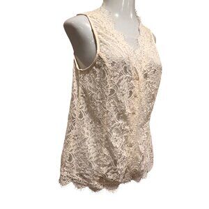 This sleeveless lace top features a V-neck, button front, and princess seaming. New with tags, excellent condition, Ivory, size XL