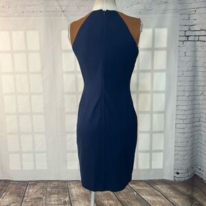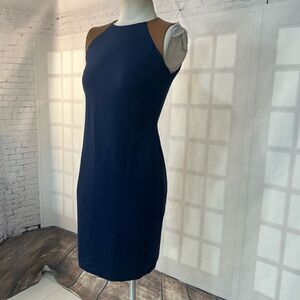 Navy blue fitted bodycon pencil dress with brown leather shoulder detail. Extremely flattering and easy to wear for work/business casual environments.