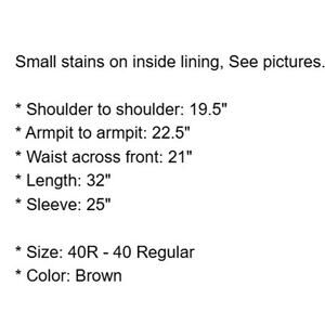 Small stains on inside lining, See pictures. Otherwise, Very Good Condition.