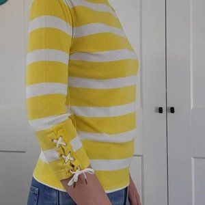 Sunshine yellow and white stripe with a nautical inspired lace up detail on the side of the sleeves.