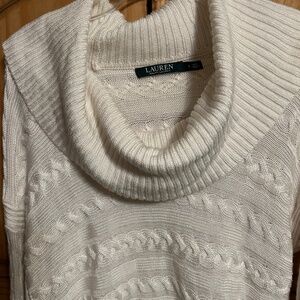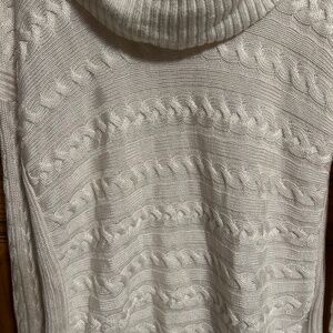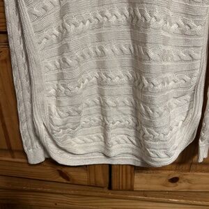 Great condition. Size S. Cream color with braided design. Longer sweater. Big scoop neck. Great for these winter days and nights. Measurements are 31 inches long and pit to pit 21. 56% cotton and 44% Viscose. Bottom is rounded and slit on sides.