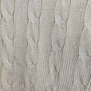 In excellent condition, this long sleeve nautical preppy tennis prep academia country club old money chic quiet luxury clean girl style sweater is perfect for layering for fall and done in a beautiful neutral off white color. Plus size 3X. Goldtone round logo buttons at one shoulder. Crewneck scoop scoopneck crew neck neckline. Allover cable detailing. Raglan sleeve detail. Side slits. Cotton Viscose blend, the Viscose adds a subtle allover sheen and cool soft touch with more fluidity than an all cotton RL LRL sweater. Rib knit trim at cuffs, neckline and hem. Cable rope stitch detail in vertical alternating panels of design. 25" pit to pit and 25" long: measurements are approximate. Coastal Grandma Emily Gilmore in Paris style.