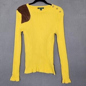 Lauren Ralph Lauren Sweater Womens XL Yellow Button Shoulder Faux Suede Patch