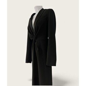 Black crepe (91% Polyester, 9% Elastane). Column. Long sleeves. Plunge neck. Back zipper closure. See size and fit notes for length measurements. Imported.