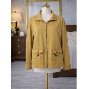 Zip up; hand pockets with zippers; gold tone
