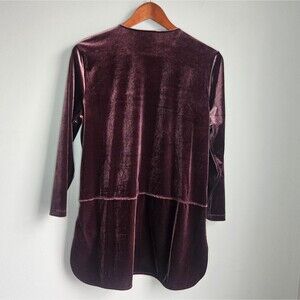 Beautiful soft 3/4 sleeve tunic top. All over velvet in a burgundy pink color. Subtle peplum seam around the waist. Featuring gold metal buttons on the shoulders.