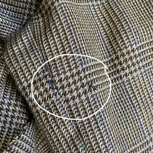 Preowned in flawed condition, has a few small burn marks - one small on the right shoulder, one large on the indside of the collar, two smalls on the cuff. Has two small holes near the sleeve’s seam.