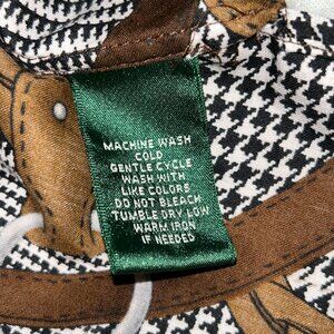 DESCRIPTION Ralph Lauren's classic equestrian print on a houndstooth background in a classic open collar relaxed fit button down shirt. Shades of brown and black on a creamy background. A vintage shirt that never goes out of style. Classy, horsey prints loved by Lauren fans. Machine wash.