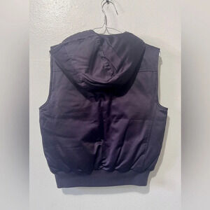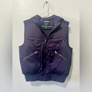 Lauren Ralph Lauren deep violet colored vest with 80% down/20% feather filling, hood, 4 front pockets- 2 zipper chest pockets and 2 zipper side pockets, quilted interior lining, full zipper closure, ribbed bottom hem.